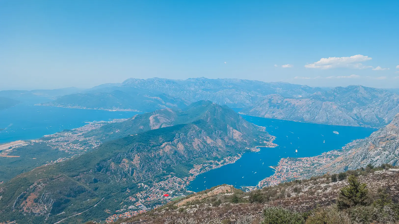 Het echte hoogtepunt zit echter bovenaan. Nog voor je begint te dalen, krijg je een volledig zicht over de Baai van Kotor — met Kotor, Tivat en de omliggende bergen in één beeld. Tijd om je camera boven te halen!