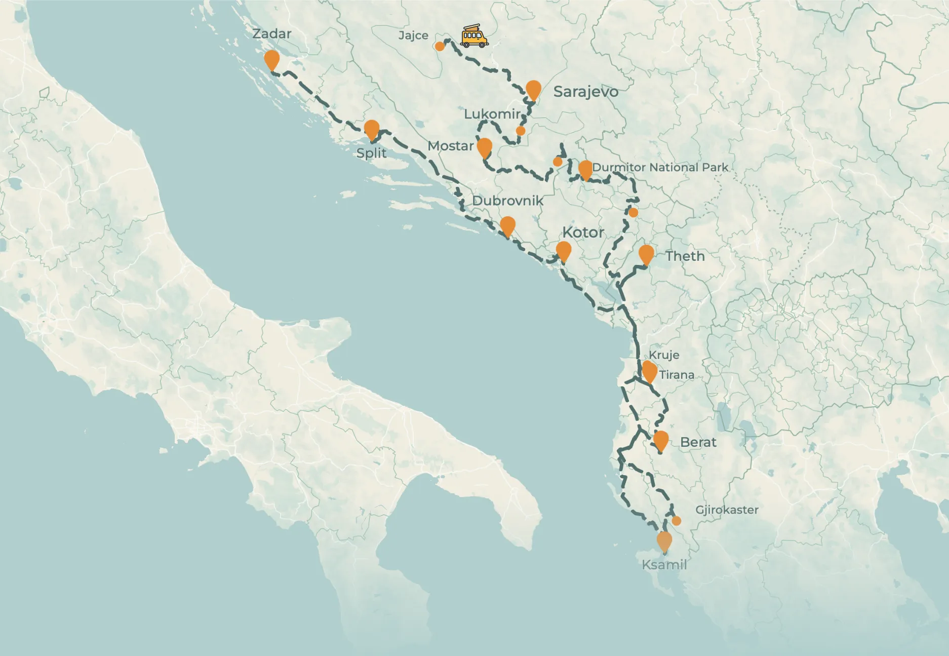 Deze roadtrip vormt een lus door de Balkan, waarbij je na een mini-stop in Zagreb, het binnenland induikt via Bosnië, daarna de bergen van Montenegro ontdekt, afzakt naar Albanië en via de Adriatische kust terugkeert.