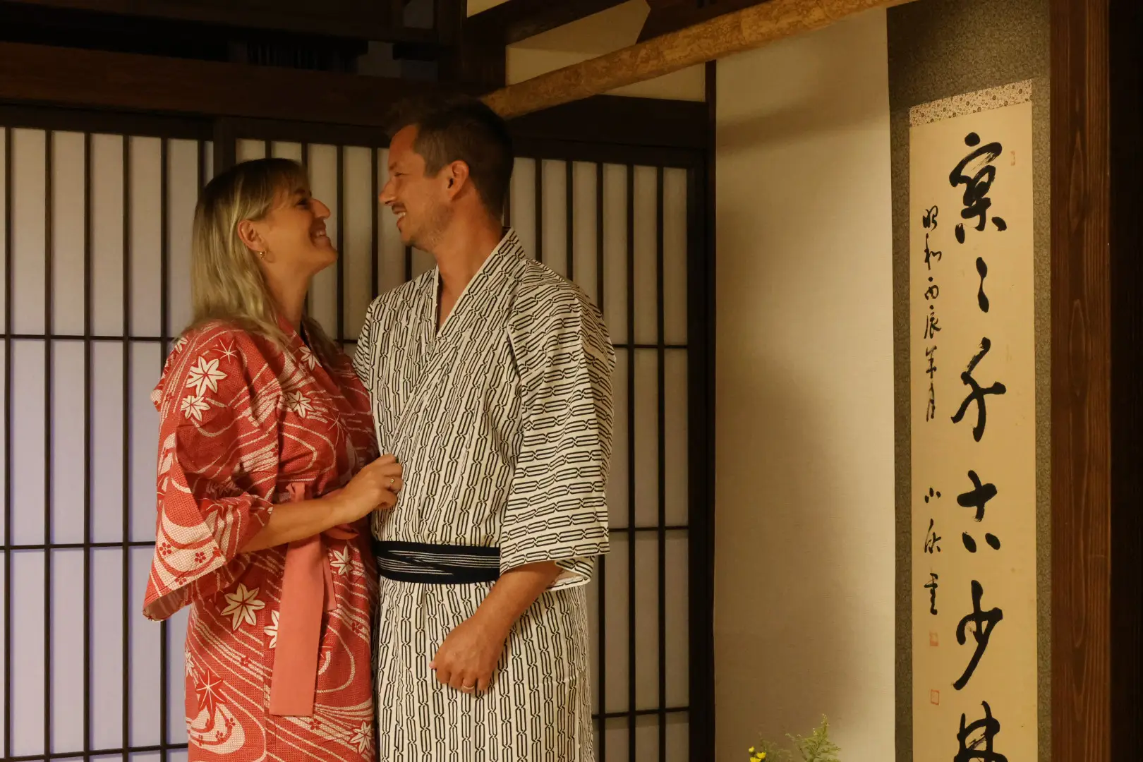 In Takayama verbleven we in Ryokan Tanabe: een klassiek Japanse ervaring met tatamimatten, futons en een Kaiseki-maaltijd in kimono. Prijs voor kamer met ontbijt en diner voor 2: €344 in juli. Op papier een topbeleving — in de praktijk vonden we slapen op een futon allesbehalve comfortabel en was het eten niet echt onze smaak. Leuk om één keer meegemaakt te hebben, maar bij een volgende reis zouden we eerder voor een comfortabeler hotel kiezen.