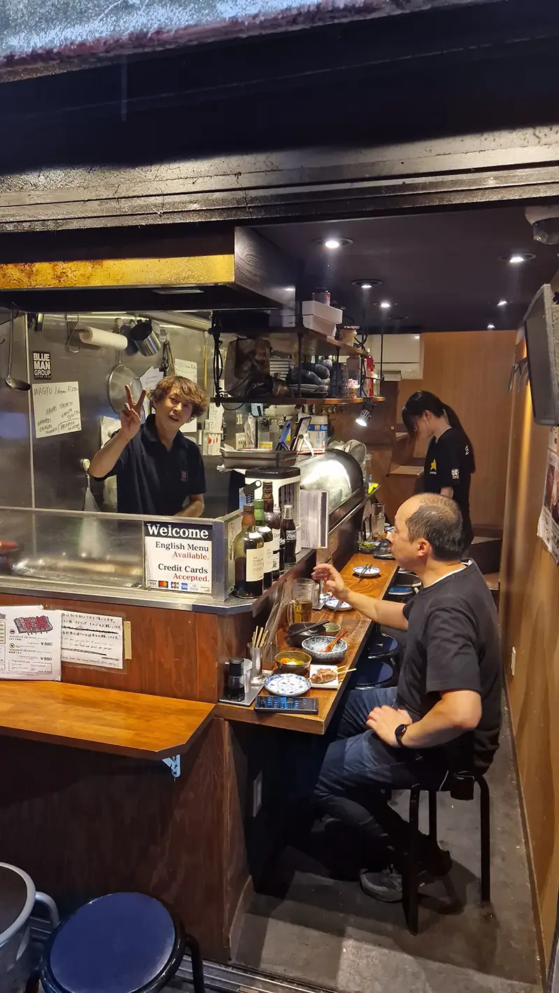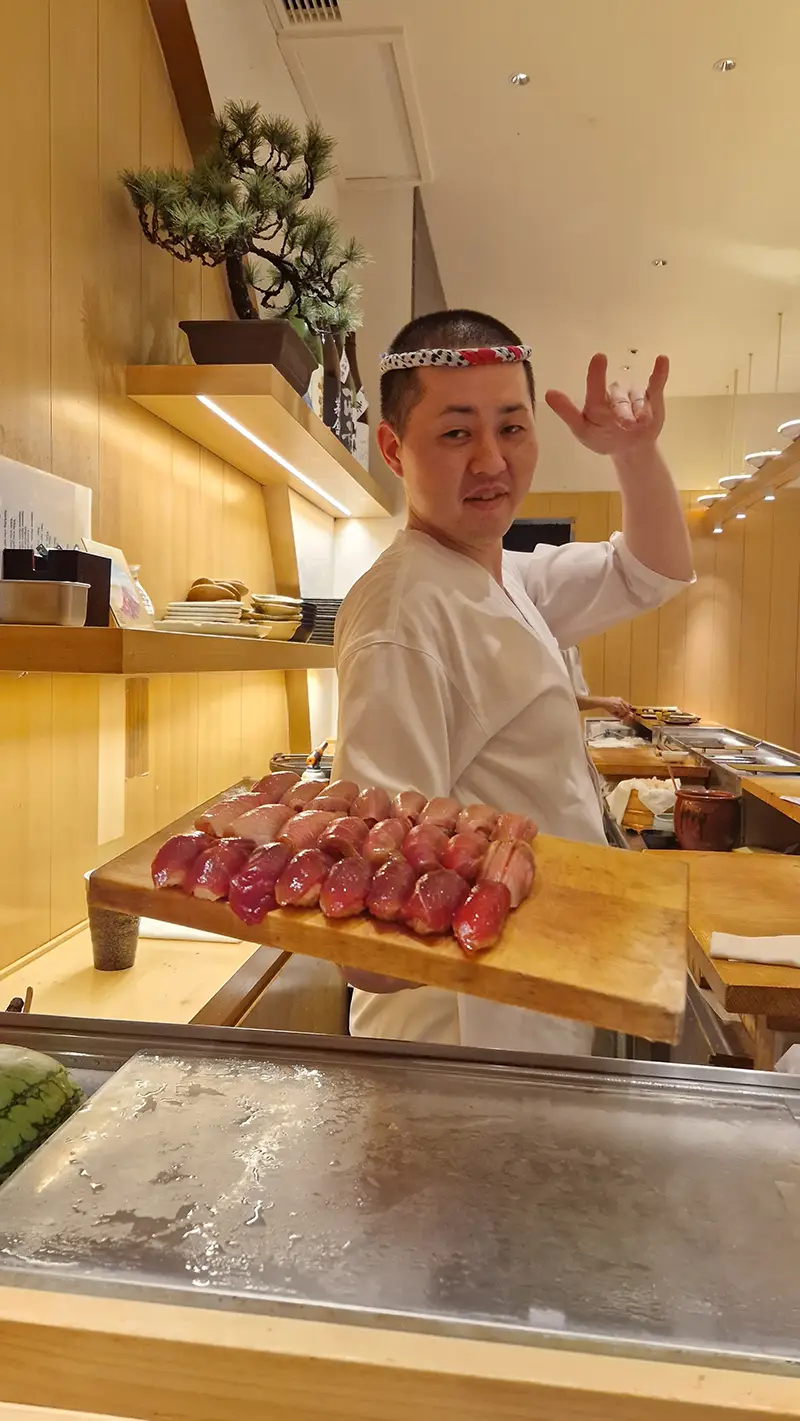 Onze omakase‑ervaring in Tokyo bij Manten Sushi Marunouchi was dan weer next level. We kregen tussen de 15 en 20 kleine gangen — elke keer een andere stijl: heerlijk verse sashimi, perfect gevormde nigiri, temaki en enkele verrassende bites die we nog nooit eerder hadden geproefd. De Crazy Sushi Chef was een echte showman: snel, theatraal, maar met een enorme passie en trots voor elk gerecht. Erg leuke avond!