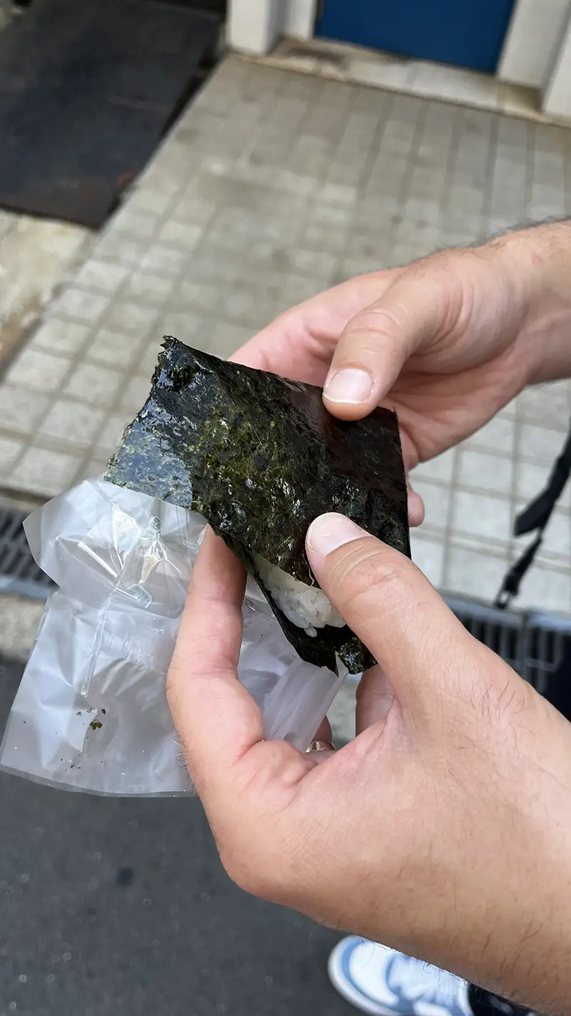 De 7‑Eleven, Lawson en FamilyMart waren onderweg onze snelle én betrouwbare stop voor ontbijt of lunch. De supermarkten zijn goedkoop, verrassend lekker en je verliest er weinig tijd mee. Onze favorieten: onigiri (tonijn mayo, zalm), egg salad sandwiches en vooral de smoothies uit de automaat. Die werken simpel: je kiest een beker uit de koelkast, scant hem, en de automaat mixt je smoothie vers in minder dan een minuut.