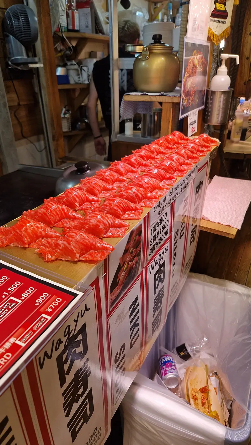 Tip: probeer in diezelfde markt ook wagyu op een stokje. Het wordt ter plaatse gegrild, is veel goedkoper dan een restaurantportie én ideaal als je gewoon even wilt testen hoe die rijke, boterachtige smaak nu precies is.